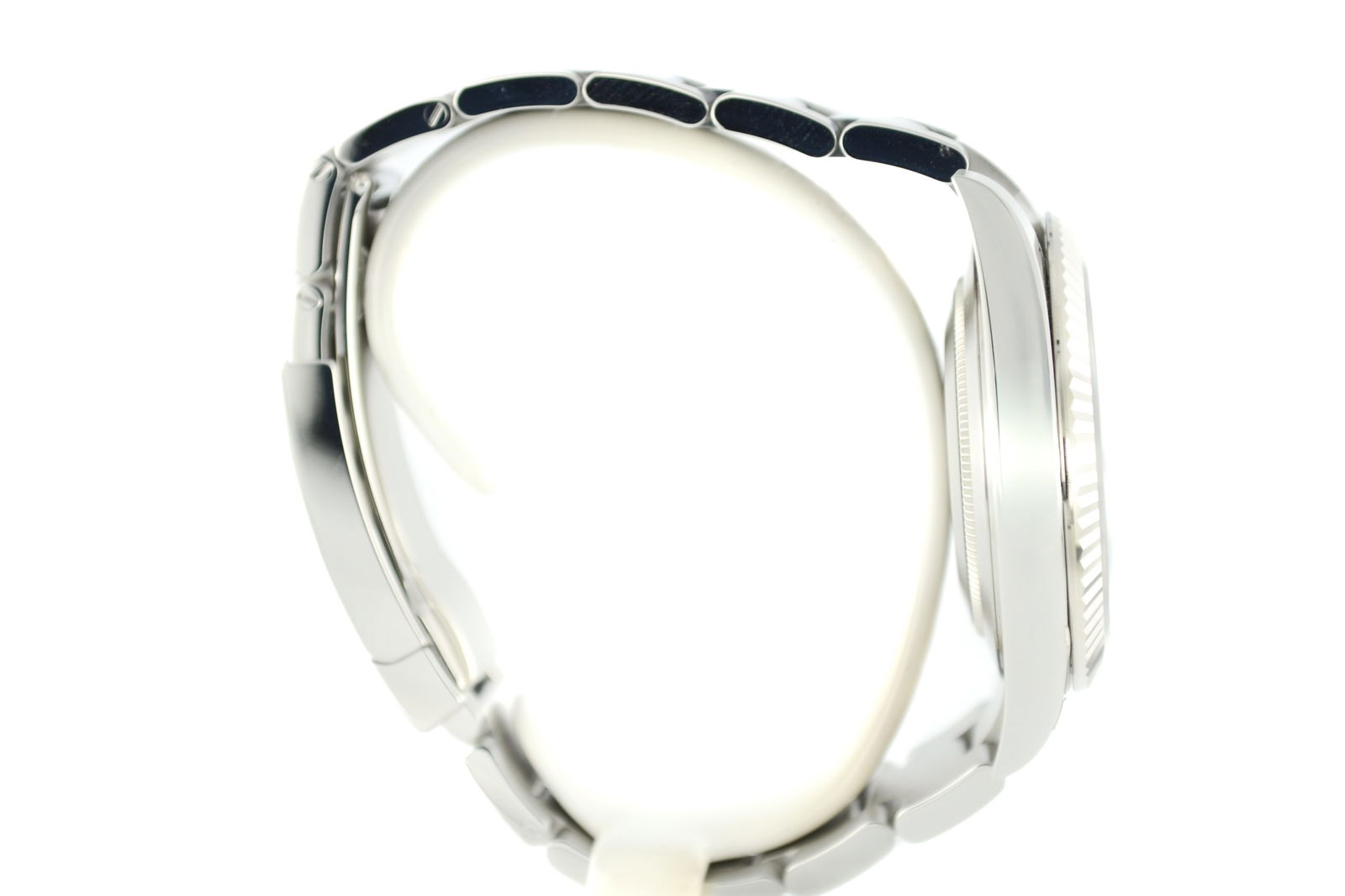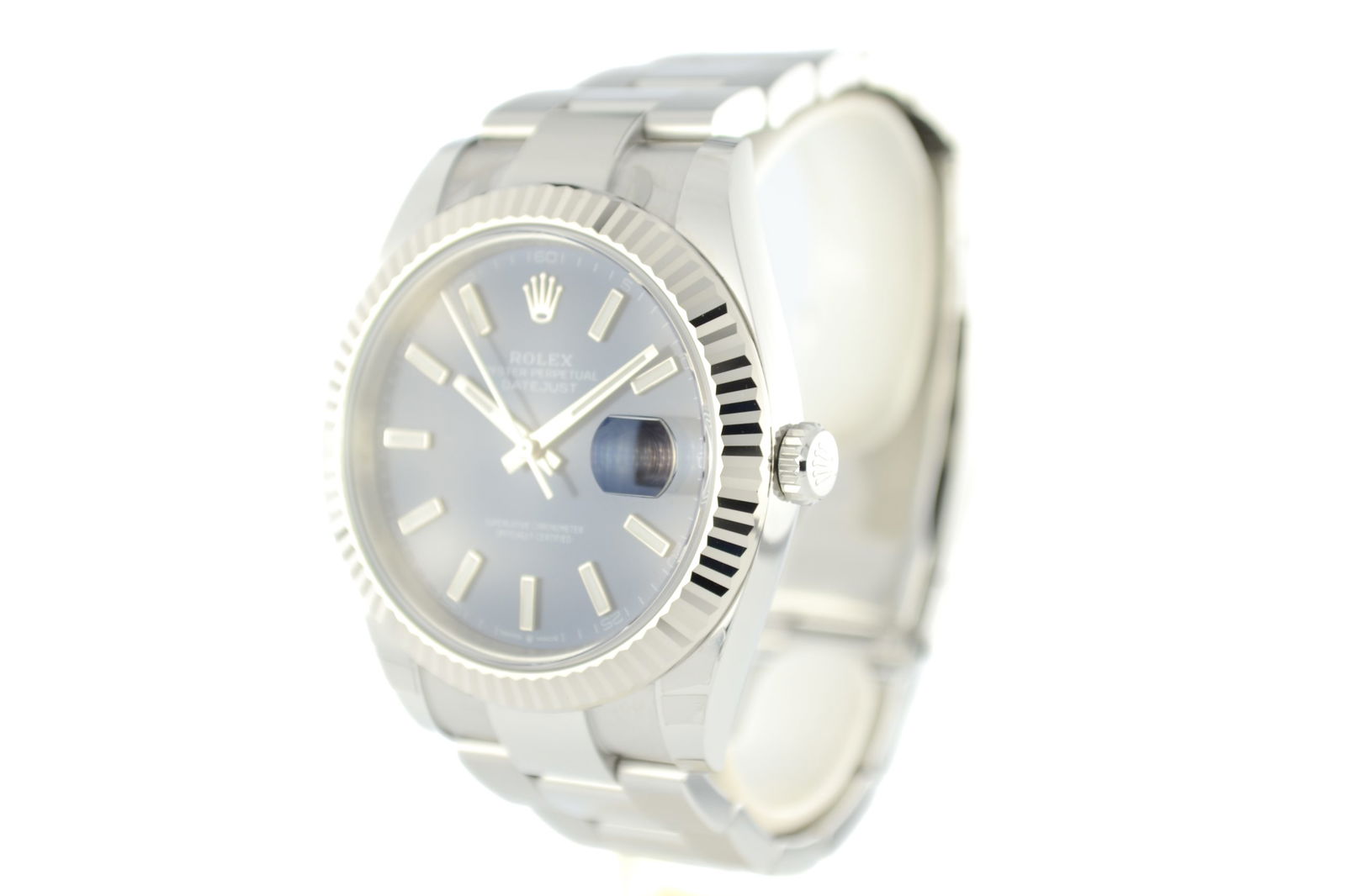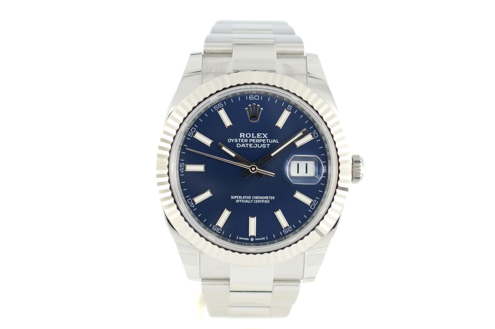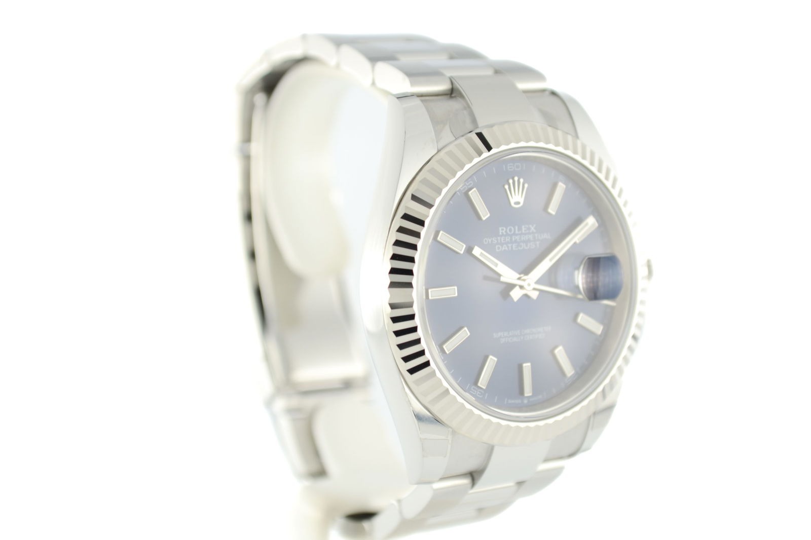 De Rolex Datejust 126334 van 41 mm combineert tijdloze elegantie met moderne details. De kast van duurzaam Oystersteel wordt omlijst door een karakteristieke witgouden geribbelde (fluted) bezel, die het horloge een verfijnde uitstraling geeft.