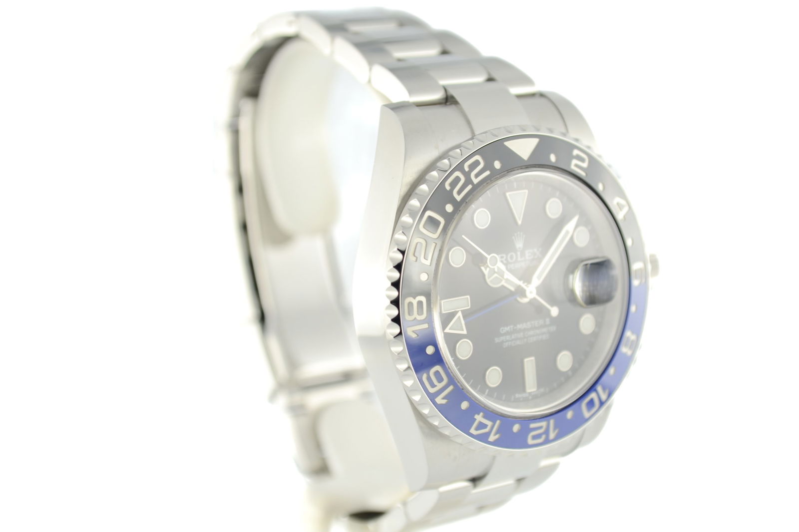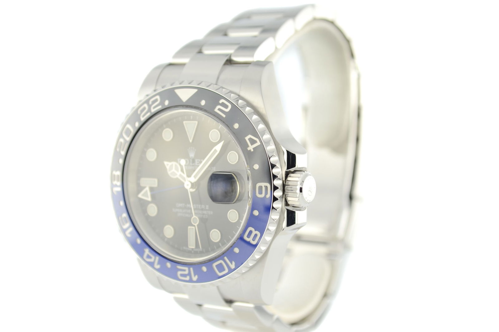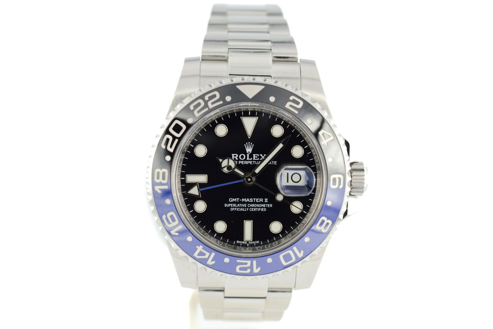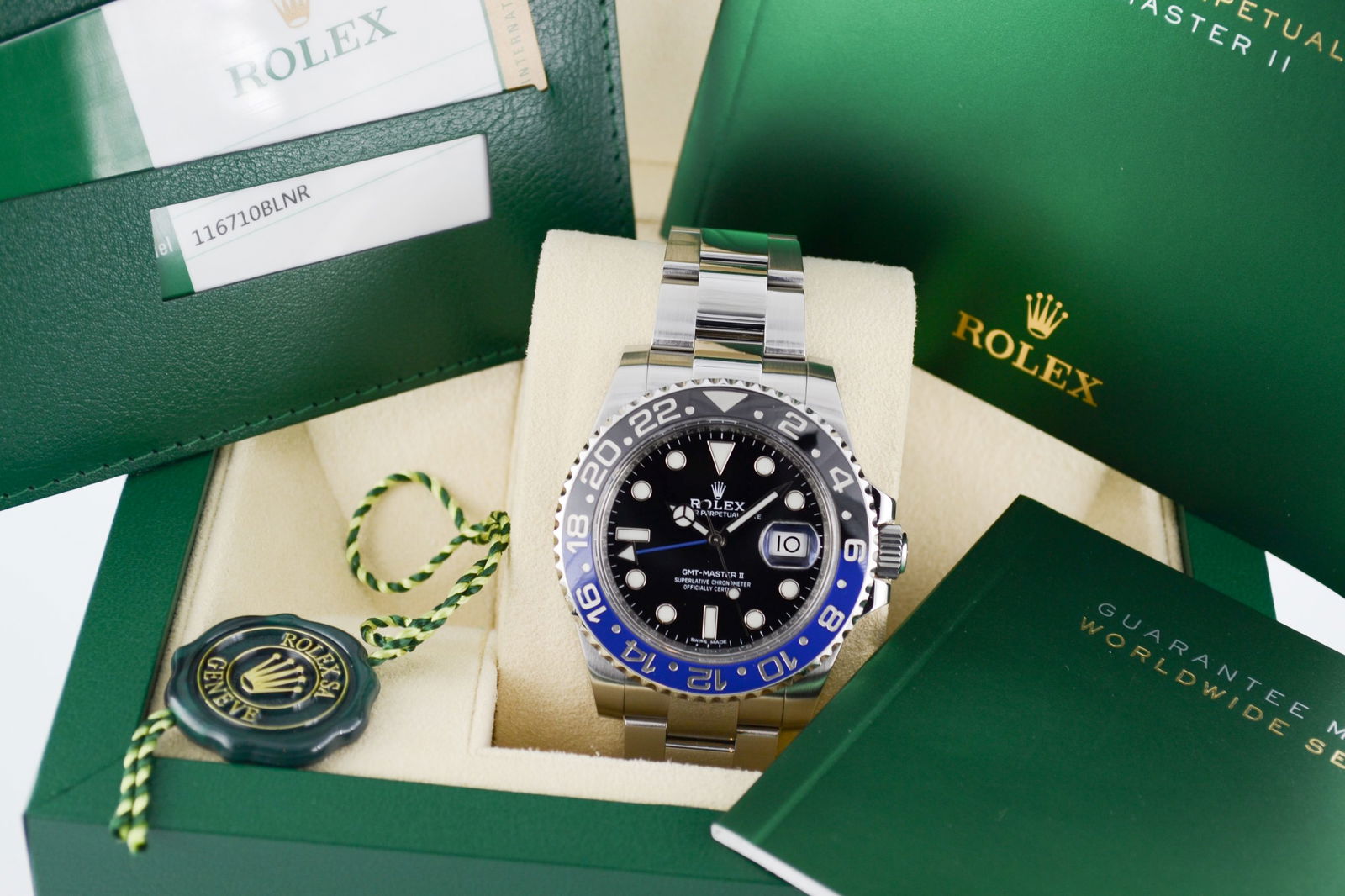 De Rolex GMT-Master II 116710BLNR, beter bekend als de “Batman,” is een modern horloge met een karakteristiek zwart-blauwe keramische bezel die direct herkenbaar is. De 40 mm Oystersteel kast combineert duurzaamheid met een sportief design.