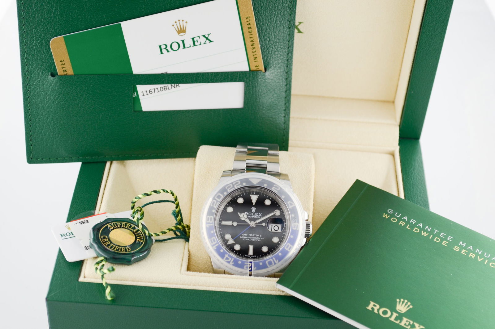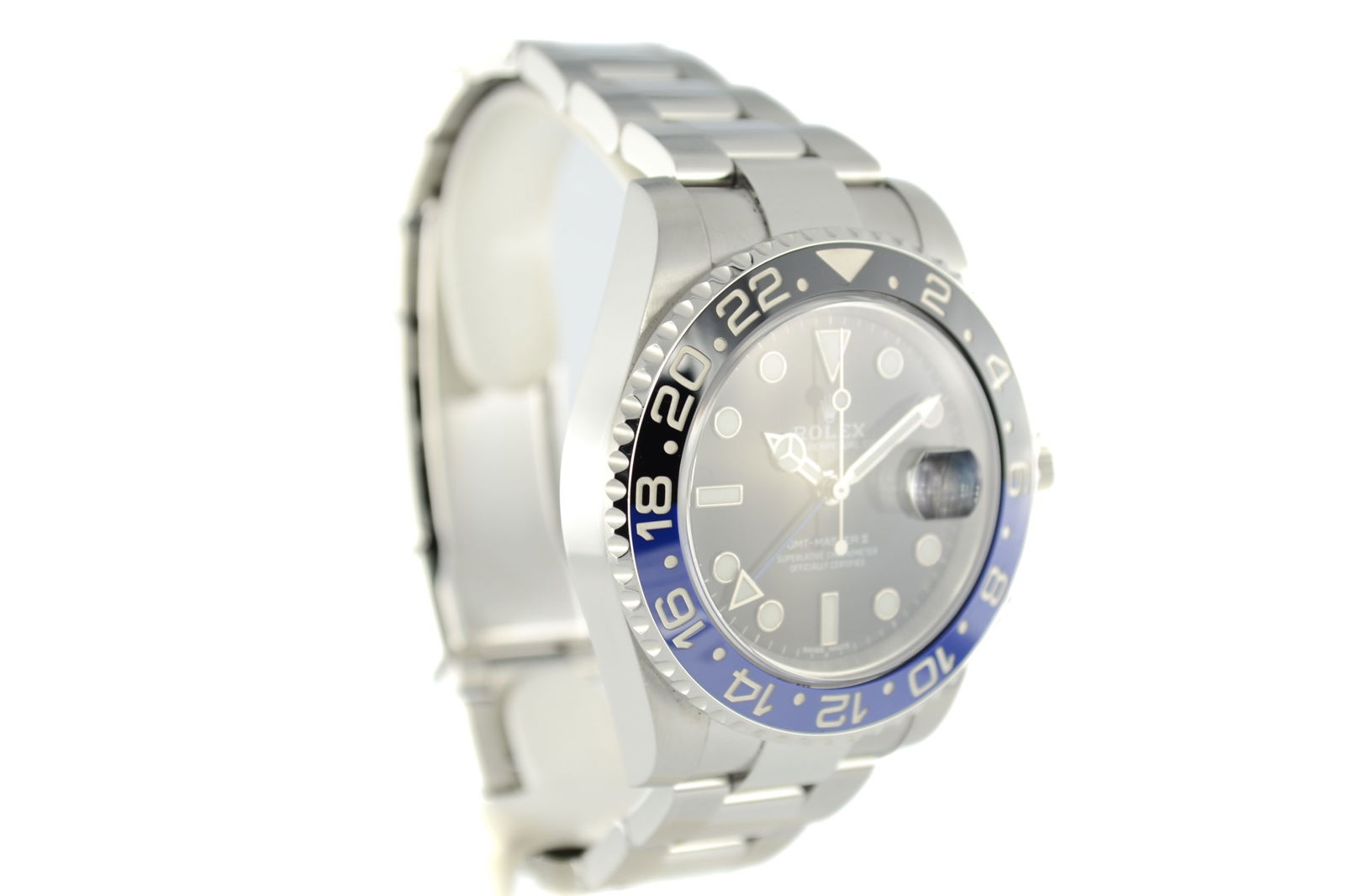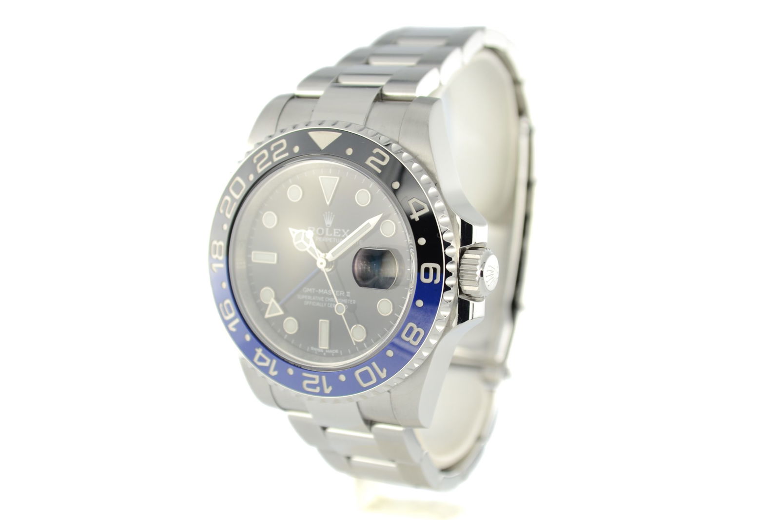 De Rolex GMT-Master II 116710BLNR, beter bekend als de “Batman,” is een modern horloge met een karakteristiek zwart-blauwe keramische bezel die direct herkenbaar is. De 40 mm Oystersteel kast combineert duurzaamheid met een sportief design.